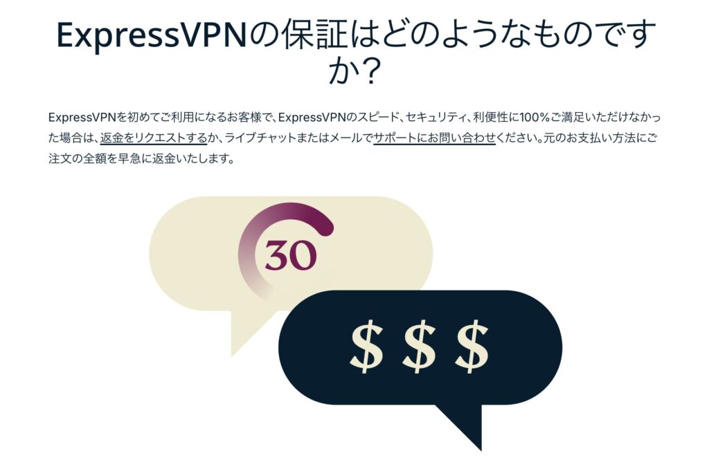 ExpressVPNでは「満足できなければ返金します」というポリシーを掲げており、30日以内に解約すれば理由を問わず全額返金を受けられます。