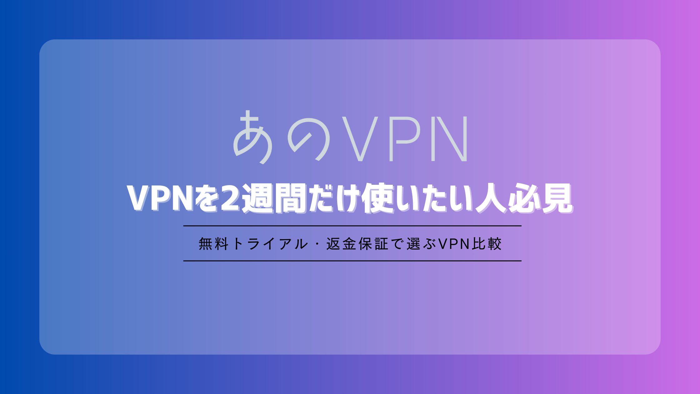 - 2週間だけVPNを使うなら、無料トライアル・30日返金保証・短期プランを目的に合わせて使い分けるのがもっともお得で安全な方法である。